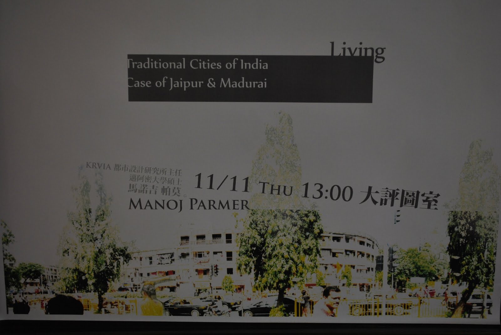 As i arrived in Taiwan; did not have enough understanding of past experiences of our exchange programe. However to my surprise i was asked to give talk on traditional cities of India. I am definitely not an expert on this subject matter but tried my best of eight hours of preparation to put to gether. I looked at the idea of Living Traditional Cities of India emphasizing the evolutionalry process based on certain principle and belief to recent readjustment that city goes through. I showed two cities: Jaipur and Madurai. Both the cities are similar in nature except the geographical location. But the most interesting thing was the nature of transformation that geography exerts on city is something to look at. Its quiet a revealing that city behaves its own was and intentions are in its own way. Perhaps it should be relooked again from academics point of veiw and take it to the studio assignment. We are very limited with our thoughts in terms of Metros and particualry Mumbai. The reasons are plenty but concerns are seems to be out of biases. I hope exchange program always looks at geographical India rather than Metros aspired and destined to be west.
