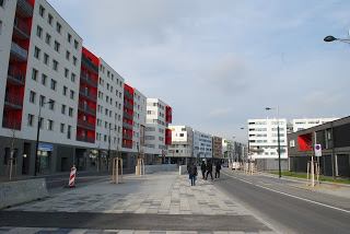The social housing was imagined as a city within a city and was usually built as peripheral block developments: a large gateway led into the often landscaped interior large open spaces, from which the individual stairways and apartments were accessed. The housing were built with regulated amenities such as swimming pools, supermarkets, Laundromats, and kindergartens were frequently situated in the common buildings.