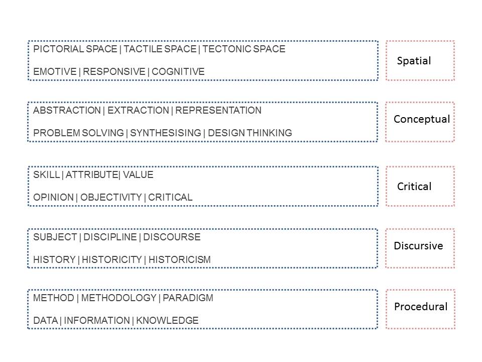There are some simple terms that we often use to frame the pedagogy for architectural education. The simple terms are sometimes confused with many other terms. The elaborative work on architectural theory across the time have propagated some of the larger concerns emanating from some simple ideas and words. The thought and trouble with such theoretical terms are in our inability to articulate the difference among several terms. It is necessary for an institute to articulate the some of the basic difference among the few terms that we often use as tool or concepts as teaching material.