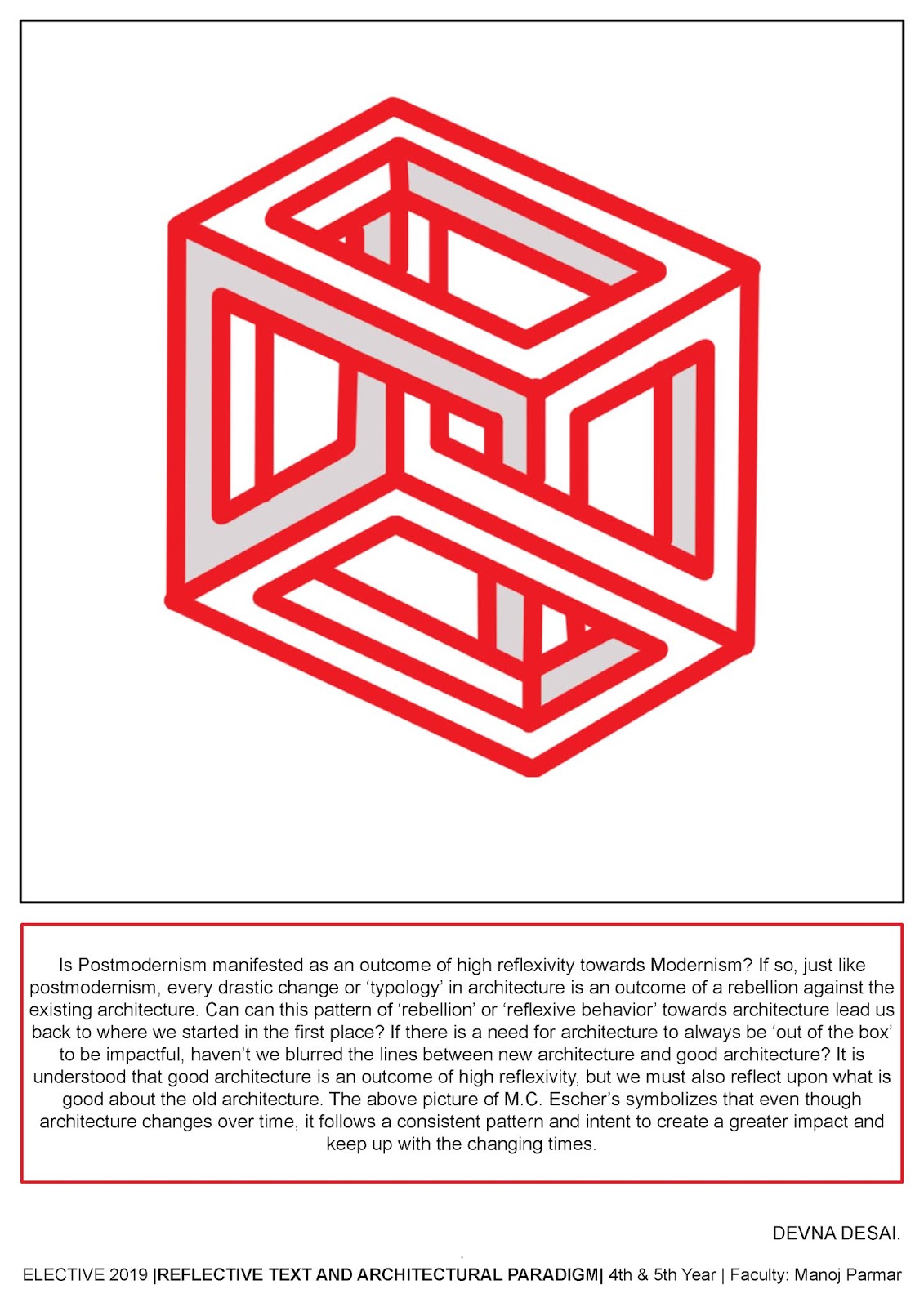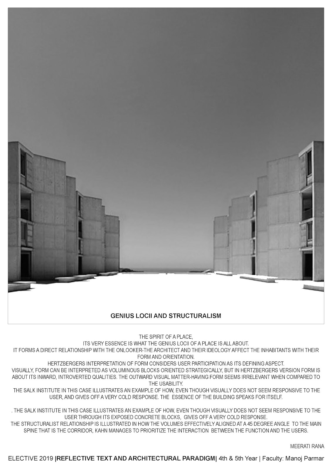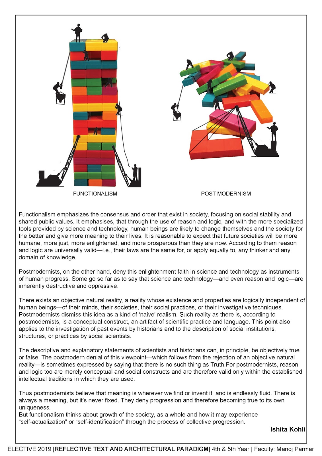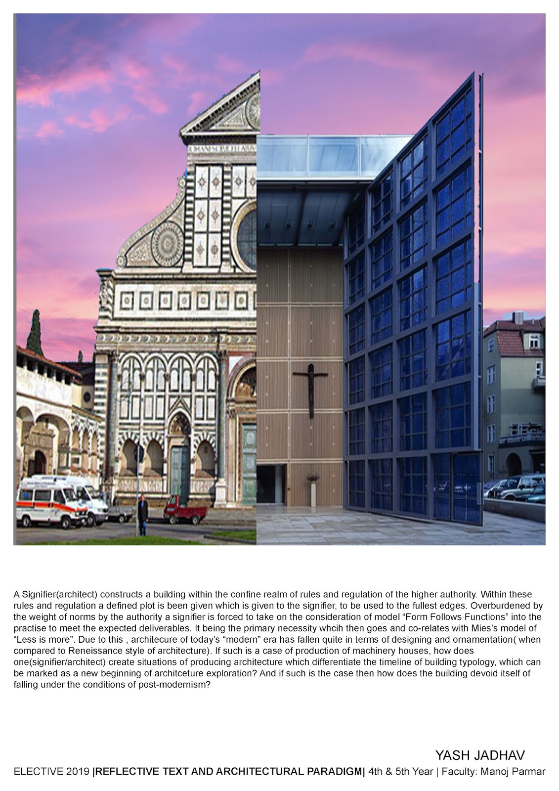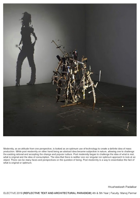 The “Reflective Text and Architectural Paradigm” intends to examine architectural paradigms through reflective text that has been operative metaphors of time, along with the philosophies that existed somewhere in the history. How such metaphors evolved, what shaped them, what is the nature of historicity and historic-ism that prevailed to have such metaphors as a reflection of time.