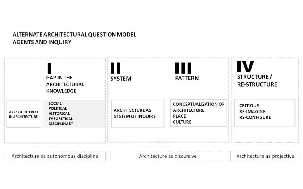 The alternate model attempts to re-locate architectural question and thinking within the realm that is necessarily operational in the range of architectural inquiry (geographical and contextual). In this situation one is able to referential-ize the study, draw relevant literature reviews so as to enable the architectonic inquiry and mobilize architectural decisions. This model emphasizes the two important aspects of architectural research, i.e. the gap in existing architectural knowledge and critiquing existing or established knowledge systems