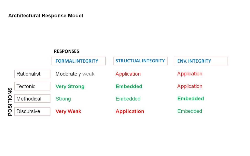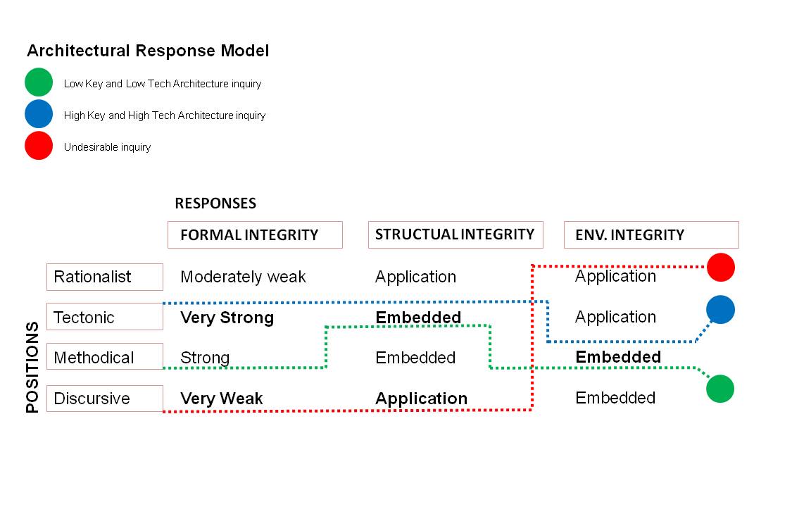 The response model for architectural questioning and thinking demonstrates that three important parameters of architectural response (architectural knowledge), i.e. formal, structural and environmental are able to generate various conditions. The tectonic and methodical inquiry is able to generate strong embedded conditions in architectural research while the discursive method requires to alter its path to make the inquiry system relevant to architectural knowledge.