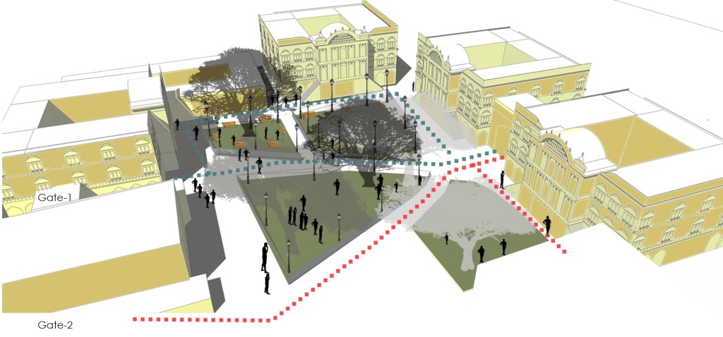 Infrastructure and tourism development are vital for urban conservation and do add to the quality of life of the community. The area of action is the core area, that is the walled city of Alwar, within the walled city 3 routes have been identified passing through the chowks , leading to the city palace . All the three routes have different characteristics. These routes form a network interconnecting each other. These chowks are now lying vacant or dead. There is no active public realm in the chowks. The proposals like introducing activities for enhancing tourism as well as for economic development, Re-adaptive use to the vacant or partially vacant buildings, Design intervention, and Restoring the character of the chowk may help in activating the chowks.