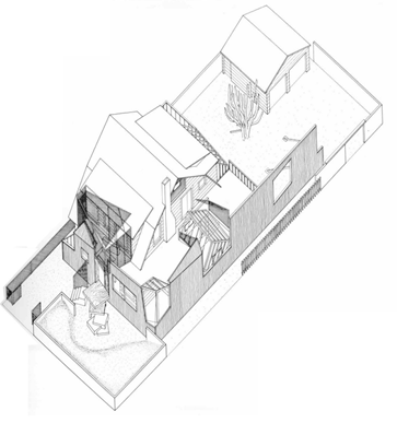 Frank Gehry’s architecture has no reliable source or framework for criticism, it embarks on eclecticism as an assemblage of tectonic. The architecture of the house does not subscribe to any formal canons. A boring but charming old house” was the starting- point for Gehry’s manipulations. The kitchen, dining room and terrace were added in such a way that they open up and partly surround the original building while nevertheless preserving its independence. Corrugated iron, wire netting and plywood boarding create the external impression of an imaginative provisional solution, while generous spaces arose inside.