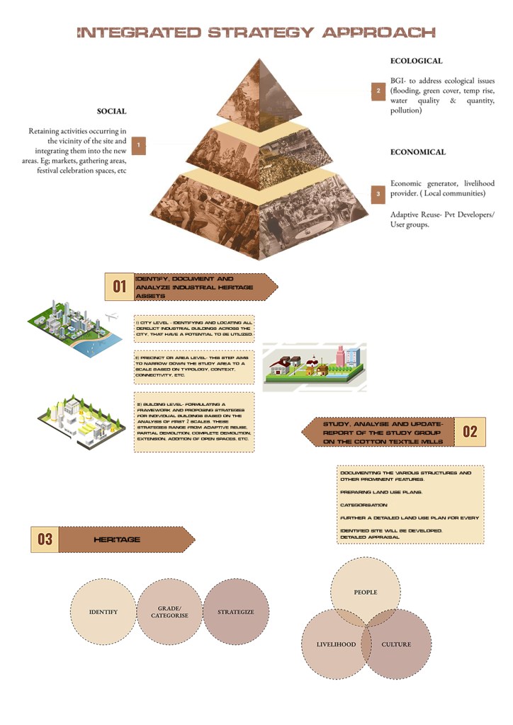 In conclusion the approaches in conjunction aim to formulate a framework that will aid in strategizing contemporary solutions to contemporary issues and utilize the derelict industrial lands of the scale: due to their scale, availability, potential and heritage value. This shall be achieved through the BGI model which provides solutions that address the social-ecological and economic issues of the city. The model will function at three major levels- city, precinct and plot. The model will not only ensure development but also aim to develop strategies that maintain, enhance and revive the heritage value. The model will propose strategies that utilize the potential of these sites in amalgamation with elements that promotes neighborhood development that benefits the inhabitants and communities and makes them sustainable and promotes their social and economic growth along with accentuating the quality of life.