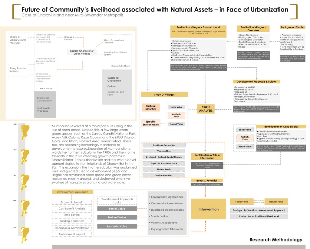 New development approach shows more inclination towards infrastructure development to make this region economically viable, while overlooking the ecological and cultural parameters that are sustaining community livelihood. Urban development is inevitable but approach towards this development should be sensitive to protect natural assets, especially the existing communities which have nurtured the landscape through changing times. This study critically analyzes the current development approach & co-relation between Natural assets and Community livelihood for the Dharavi Island and will provide with an alternate approach which can help in protecting the Ecological assets & Community livelihood along with addressing the infrastructure development needs & urban growth trajectories.