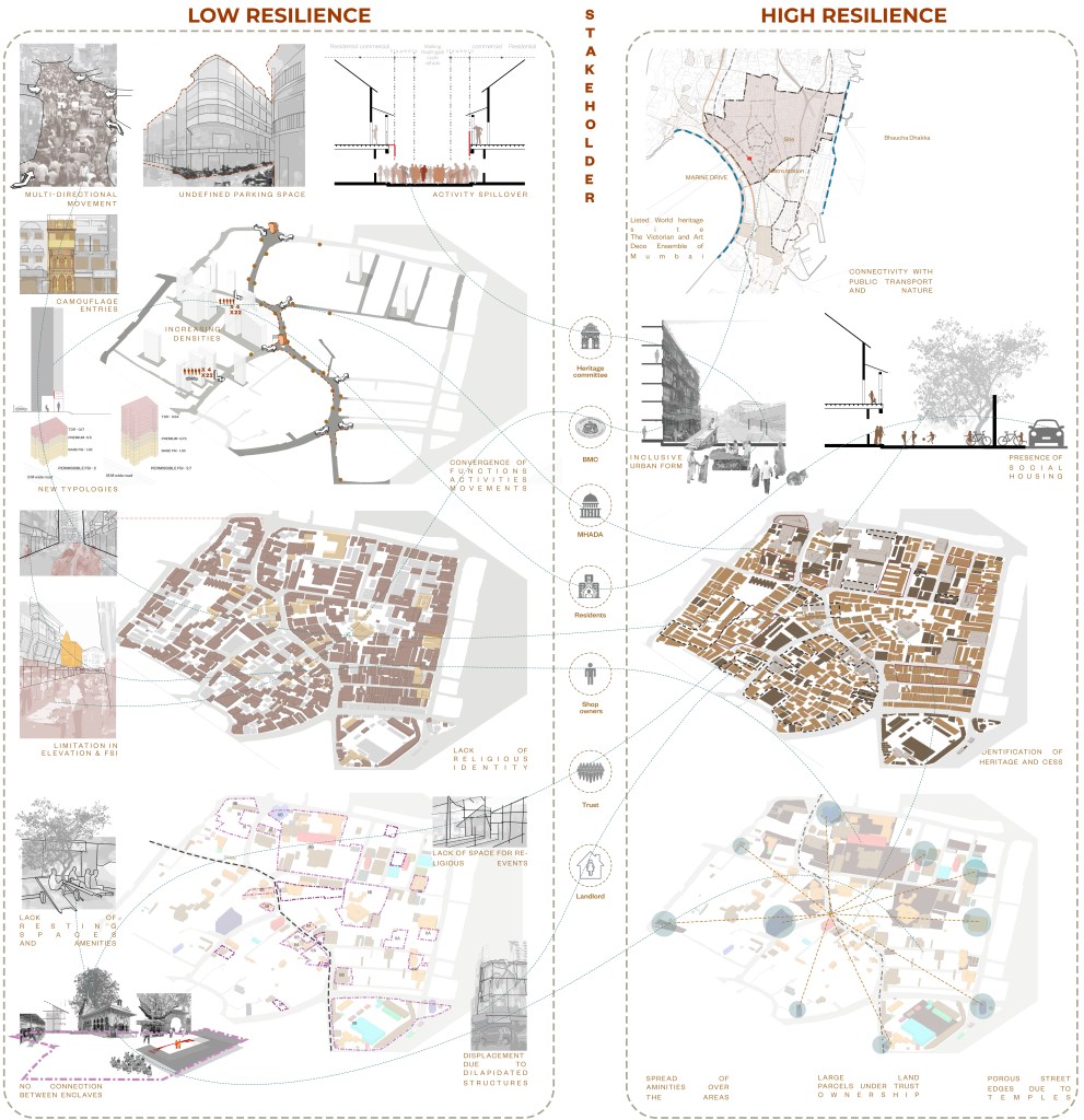 The thesis tries to establish the need to Retain, Repair, Reuse or Redevelop historic built forms by categorizing them into high-resilient and low-resilient zones to avoid the homogeneity of urban form in the historic native town of Mumbai. The continued existence of historic urban forms, making them sustainable, allows us to understand their formation and evolution and implement it in new development modules.