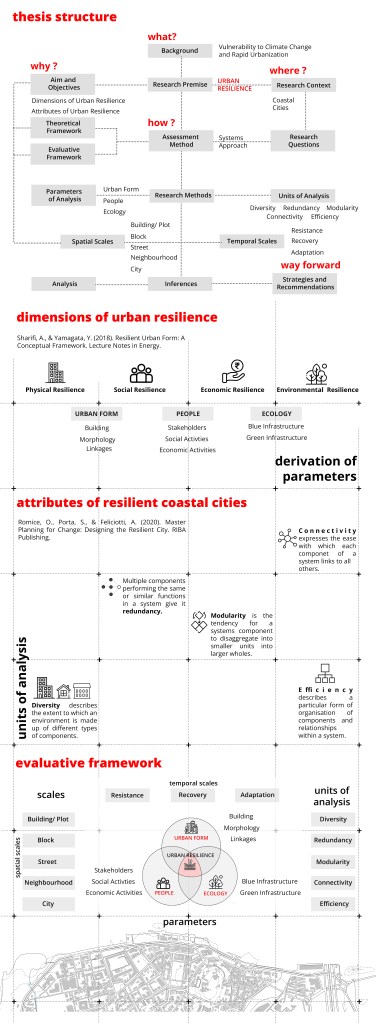 However, there is limited understanding of the interaction between urban and coastal systems, yet it is significant because these factors inform the urban form of the cities and have a direct impact on how people move through these coastal zones and the resilience of these systems to disruptions. While the urban form of cities may be considered non-deformable and rigid, its properties influence urban socio-economic and environmental dynamics. Despite a large body of literature published on urban resilience, research on resilience of urban form is still scarce. This thesis seeks to take a step towards filling this gap by discussing the concept of resilience thinking, identifying critical parameters and units of analysis leading to vulnerabilities and inadequacies in resilience planning and implementation by developing a conceptual framework for analyzing urban resilience in coastal cities.