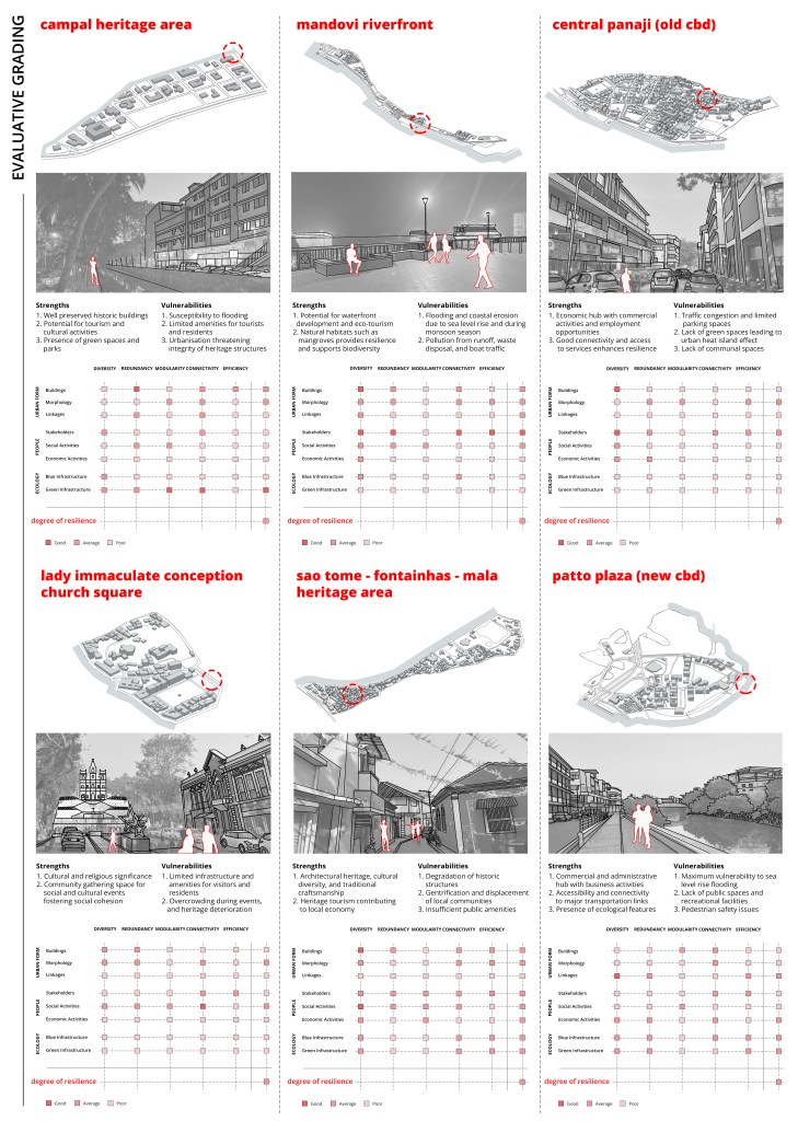 The study employs a systems approach to uncover the inter-dimensional relations between urban form, people, and the ecology. Despite the evaluative framework being generic, the findings and recommendations in this thesis intend to be context- specific and hence the coastal city of Panaji has been taken as a case study. By analyzing site-specific vulnerabilities and stakeholder perspectives, the research intends to identify contextually appropriate strategies for the adaptation of urban forms, promotion of socio-economic diversity, and the integration of ecosystem-based strategies at spatial scales of building/ plot, block, street, neighborhoods, and city level as well as temporal scales of resistance, recovery, and adaptation to enhance the overall resilience and sustainability of coastal cities. Keywords: urban resilience, coastal cities, systems approach, resilience assessment, strengthening networks.