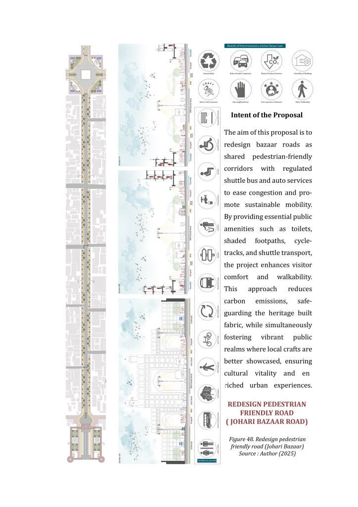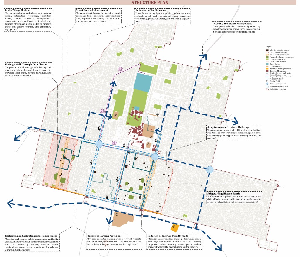 The Structure Plan outlines an integrated set of strategies to strengthen cultural identity, urban livability, and heritage conservation. It proposes a Crafts Village Module as a modular craft cluster integrating workshops, exhibitions, residencies, cafés, and local retail, supported by street façade enhancement guidelines to reinforce the visual character of historic streets. Key public nodes are activated as cultural and social hubs, while curated heritage walks connect craft clusters, public spaces, and historic streets. Mobility strategies include traffic restriction on primary bazaar roads, pedestrian-friendly shared streets, and organized parking provisions. Adaptive reuse of historic buildings and the reclamation of chowks and courtyards support cultural activities, local economies, and tourism, alongside safeguarding historic fabric through stricter by-laws and restoration incentives.
